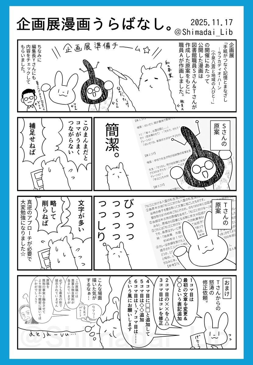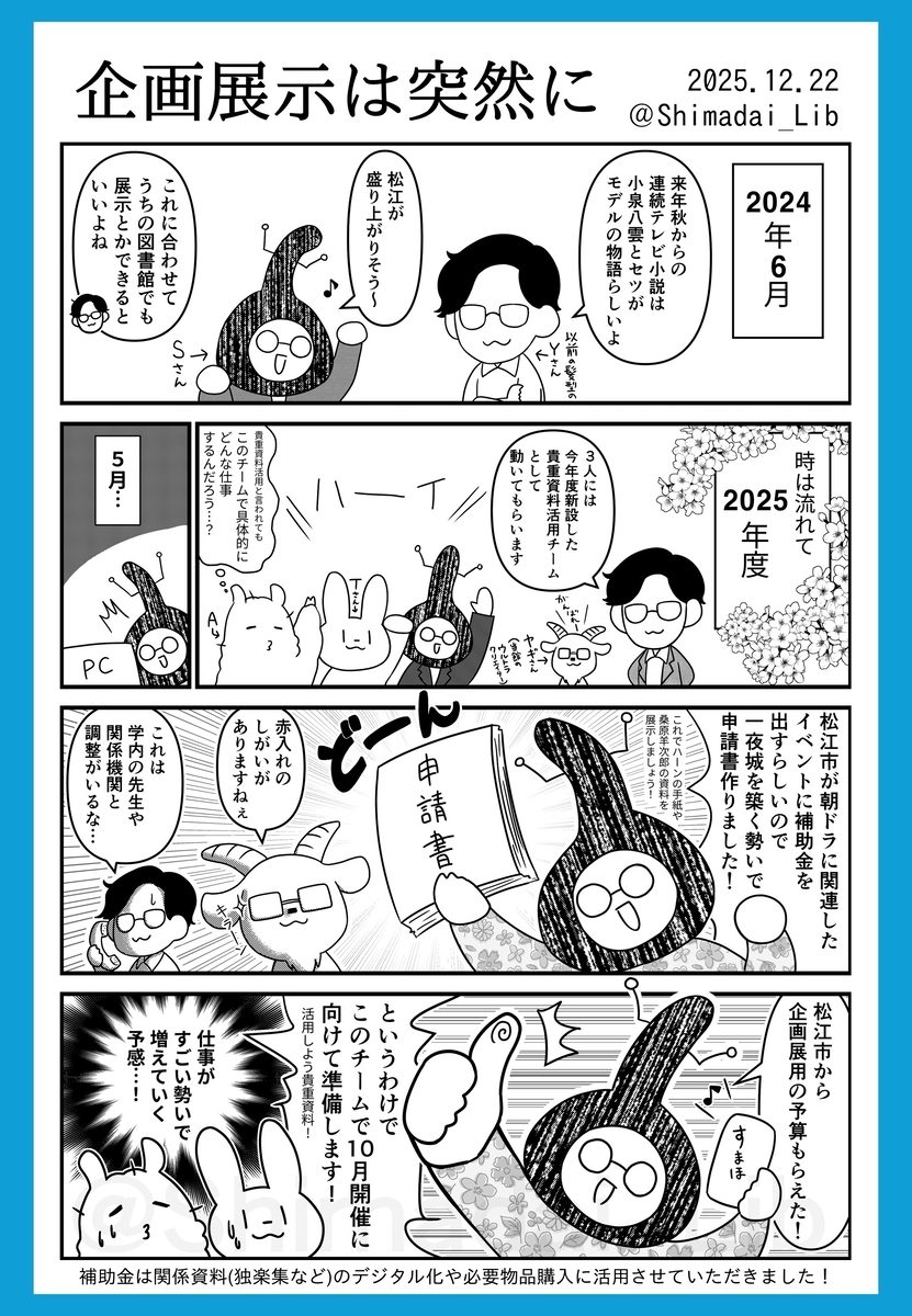今回は、10月15日から12月1日にかけて島根大学附属図書館で開催した企画展『手紙がつなぐ記憶とまなざし―ラフカディオ・ハーン(小泉八雲)と地域の人びと―』( https://www.lib.shimane-u.ac.jp/new/2025092500014/ )の裏話を描いた漫画を3本お送りします。